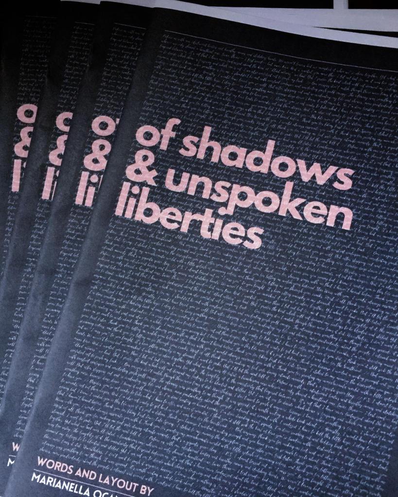 of shadows & unspoken liberties is a zine I created to indulge in memory, secrecy, and all the things I couldn’t say out loud. It’s an intimate piece. It is raw and unfiltered, written during a time I was still trying to make sense of the mess I found myself in.